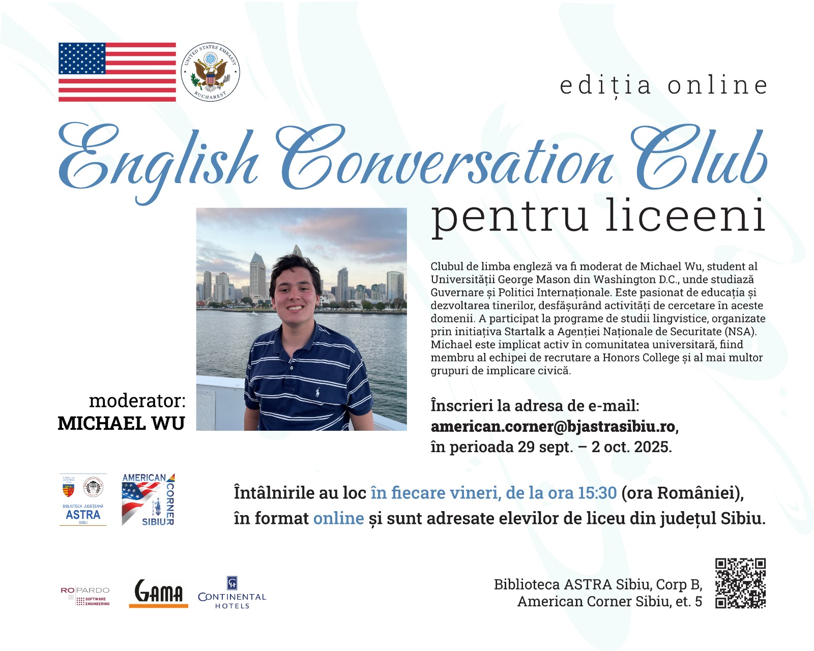 Biblioteca Județeană ASTRA Sibiu, prin American Corner Sibiu, în parteneriat cu Ambasada S.U.A. în România, lansează un nou proiect educațional dedicat liceenilor: English Conversation Club – ediția online, un program care promovează comunicarea interculturală, leadershipul tinerilor și excelența în educație.