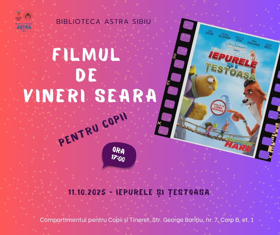 Prichindeii sunt invitați vineri, 10.10.2025, de la ora 17:00, la Compartimentul pentru Copii și Tineret, pentru a viziona filmul de animație „Iepurele și țestoasa”. Acesta este dublat în limba română și are o durată de 72 minute.