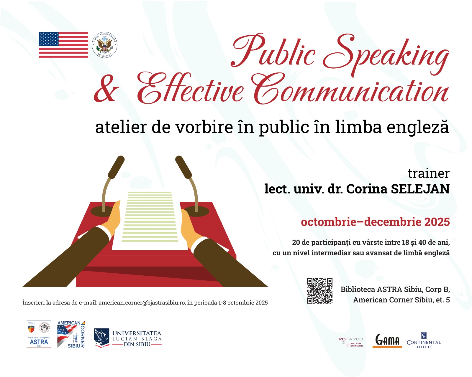 Biblioteca Județeană ASTRA Sibiu, American Corner Sibiu și Universitatea „Lucian Blaga” din Sibiu, cu sprijinul Ambasadei Statelor Unite ale Americii în România, lansează un atelier educațional dedicat dezvoltării abilităților de comunicare în limba engleză și formării competențelor esențiale de vorbire în public. Prin acest program, Biblioteca Județeană ASTRA Sibiu și American Corner Sibiu continuă să fie parteneri activi ai comunității, susținând educația autentică, formarea caracterului, spiritul critic și informarea corectă. Atelierul „Public Speaking & Effective Communication” va avea loc în perioada octombrie-decembrie 2025, cu frecvență săptămânală, pe durata a 10 sesiuni (câte 2 ore fiecare), și este destinat unui grup de maximum 20 de participanți cu vârste între 18 și 40 de ani, cu un nivel intermediar sau avansat de limbă engleză.